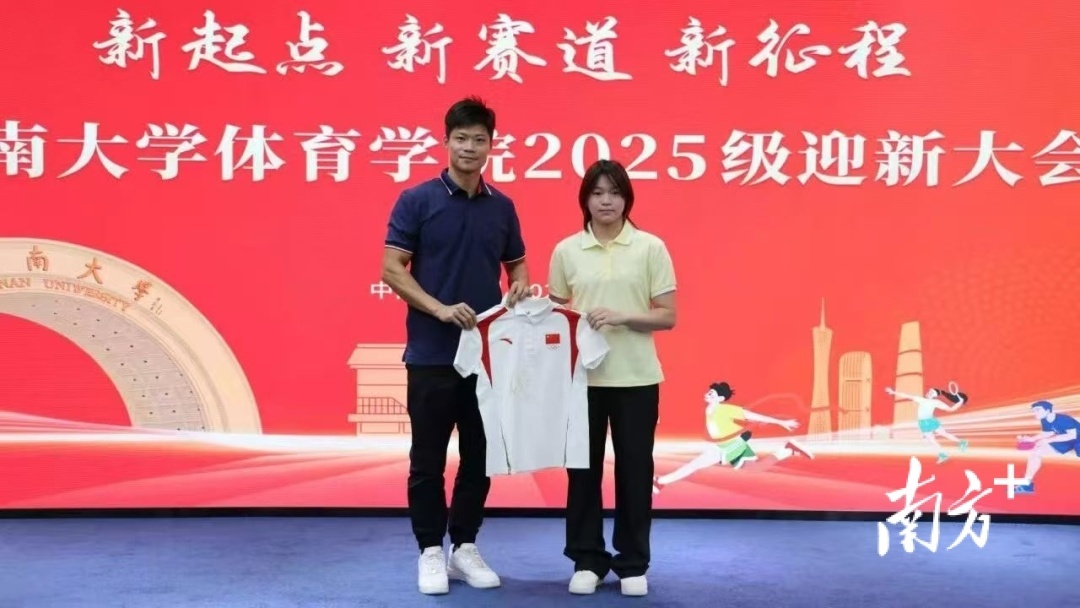 当晚,暨南大学体育学院举行2025级迎新大会,为每位新生拍摄入学纪念照,并送上入学明信片,邀请新生写出大学的目标和愿望。全红婵参与迎新活动,现场送给体育学院一件亲笔签名的巴黎奥运会出场服。体育学院院长苏炳添代表学院接受捐赠,与全红婵合影留念。