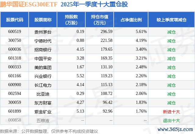 从基金规模来看,鹏华国证ESG300ETF基金2025年一季度公布的基金规模为0.53亿元,较上一期规模7301.87万元变化了-2018.85万元,环比变化了-27.65%。该基金最新一期资产配置为:股票占净值比97.48%,无债券类资产,现金占净值比2.01%。从基金持仓来看,该基金当季前十大股票仓位达28.98%国融资管,第一大重仓股为贵州茅台(600519),持仓占比为5.61%。
