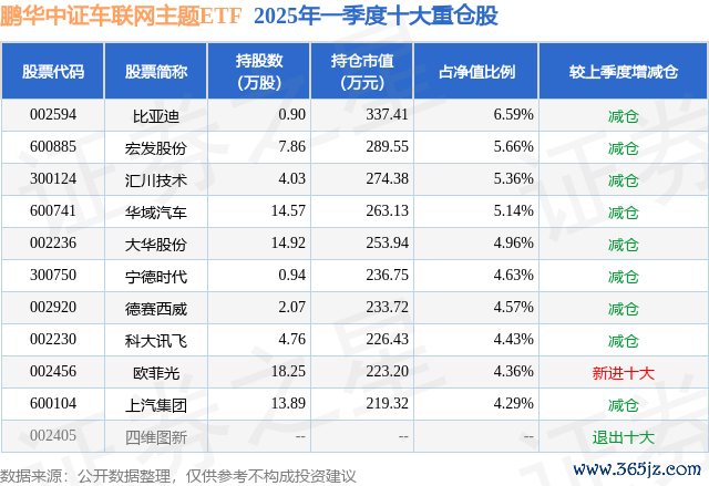 从基金规模来看,鹏华中证车联网主题ETF基金2025年一季度公布的基金规模为0.51亿元,较上一期规模5085.08万元变化了31.73万元,环比变化了0.62%。该基金最新一期资产配置为:股票占净值比98.64%,无债券类资产,现金占净值比1.23%。从基金持仓来看点点金,该基金当季前十大股票仓位达49.99%,第一大重仓股为比亚迪(002594),持仓占比为6.59%。